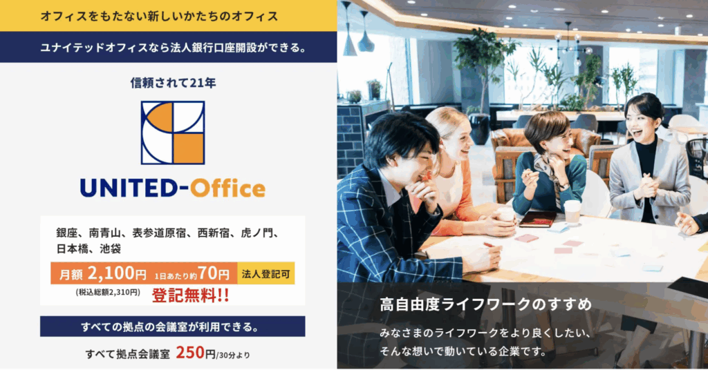 ユナイテッドオフィス2,100円〜銀座・新宿・渋谷など登記、郵便転送、電話秘書代行