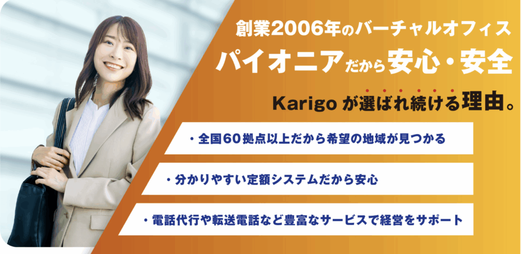 Karigo3,300円〜全国50拠点以上(地方も対応)登記、郵便転送、電話番号提供