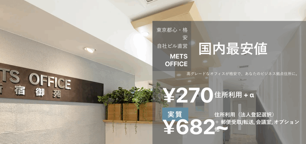 METSバーチャルオフィス270円〜銀座・渋谷など登記、郵便転送、レンタル会議室