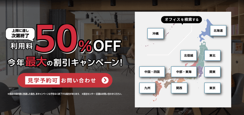 全国に50拠点以上展開しており、地方都市でも利用可能です。複数拠点を持ちたい事業者に便利です。