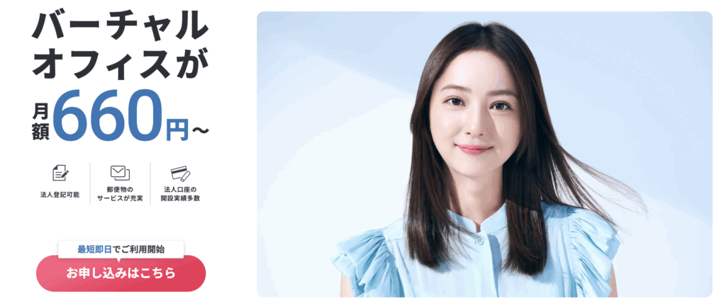 業界最安水準の月額660円から利用可能。東京・横浜・名古屋・大阪・京都・神戸・福岡の一等地住所が選べ、法人登記や郵便物転送サービスも充実しています。